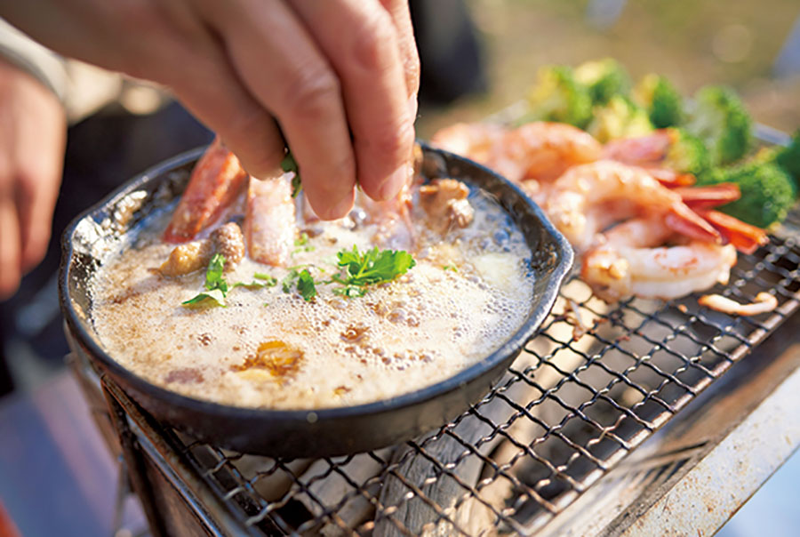 グリルに合わせて、炭火にかけられる小型フライパンや耐熱性の高い器があれば、調理の幅がグンと広がる。