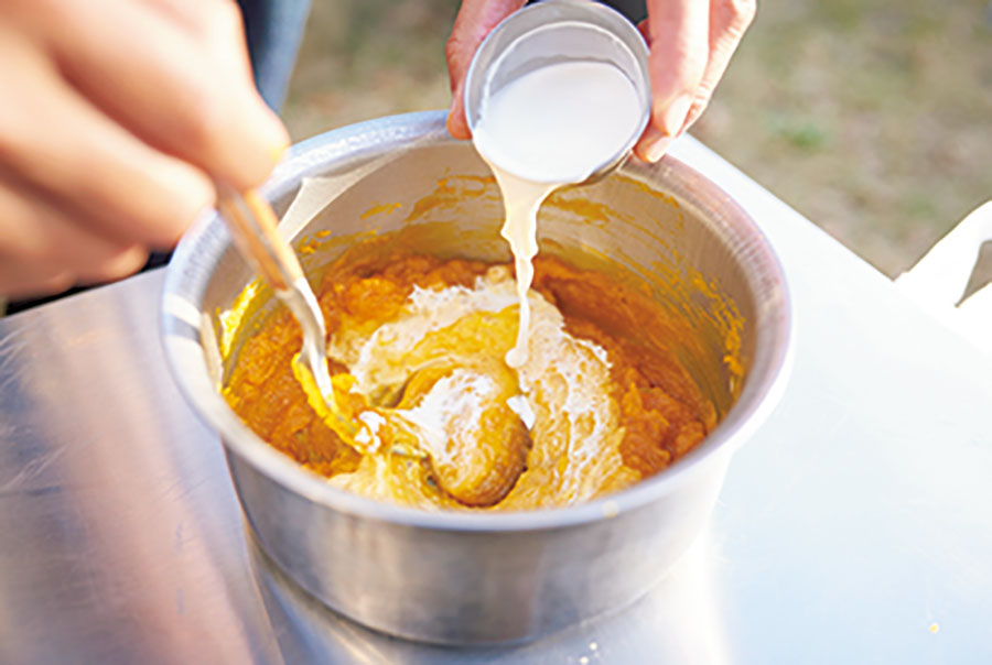 - カボチャが少し冷めたら皮を剥いて潰し、はちみつ、生クリーム50㎖を加えて混ぜ、ペースト状にする。