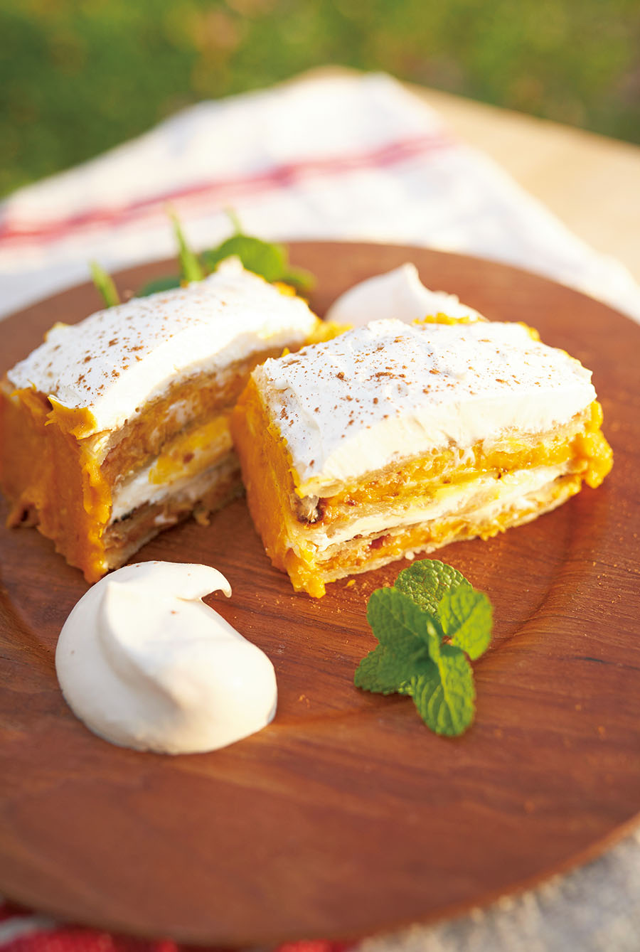 - 重ねたパイの側面にカボチャペーストを塗り、ホイップクリームを添え、仕上げにシナモンを振る。