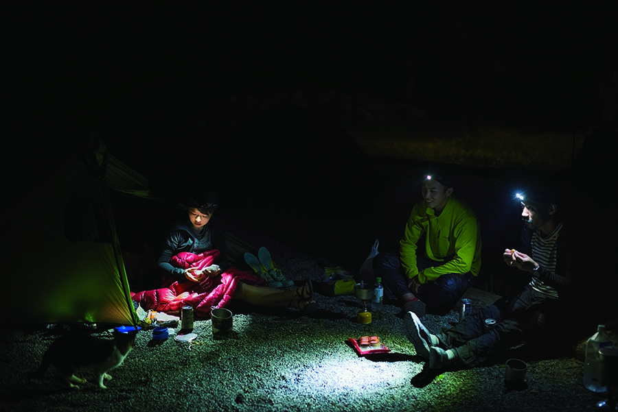 「あのう、これ、どうやって立てるんですか?」。テントを初めて買ったら、まずは庭や近所で試してみるものだが、今回は撮影用の借り物。ふたりは初めてのテントに悪戦苦闘しつつ、夕暮れ前には各々の家が完成した。我が家を見て、満足気なふたり。嬉しそうに寝転ぶ若様の足が心なしかツエルトからはみ出ていた。