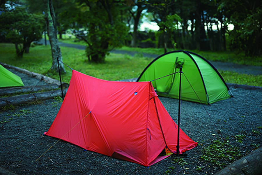 バランスに優れるのがツエルト(写真手前)。だが設営には少々慣れが必要だ。その点、軽量なシングルウォールテント(写真奥)は設営も簡単。雨などの天候リスクはあるが、虫が苦手でなければ、圧倒的な軽さが特徴のフロアレスシェルターという手もある。