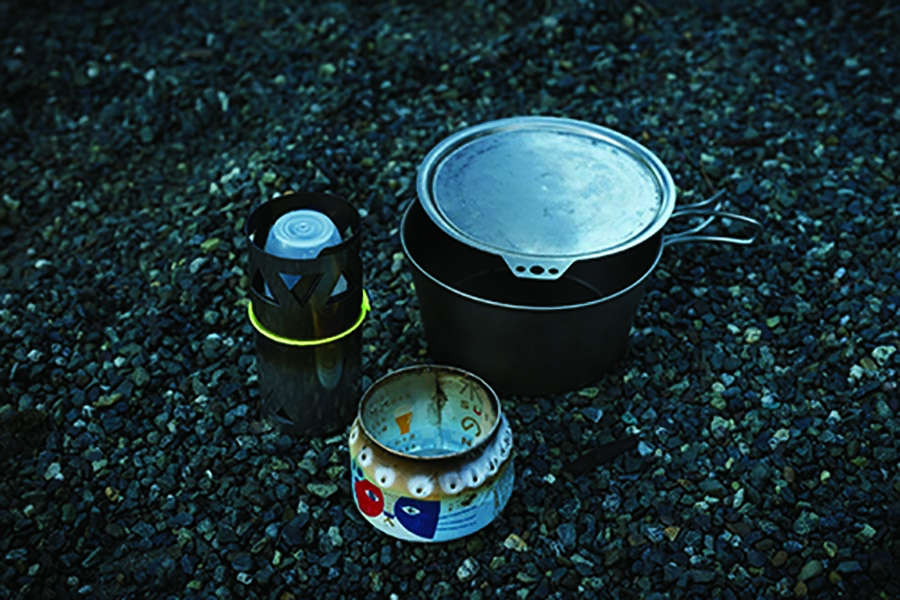 火器はガスバーナーが一般的。小さく軽量なものもあり、選択肢は幅広い。しかし湯沸しだけであれば、思い切って固形燃料やアルコールストーブにチャレンジしてみよう。写真は空き缶で作った手製のもの。アルコールは燃焼時間に合わせて量っておくと良い。