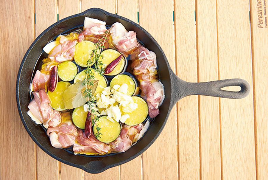 1.鶏モモ肉、ナス、ニンニクをスキレットに並べ、とうがらし、タイム、ローリエを乗せる。