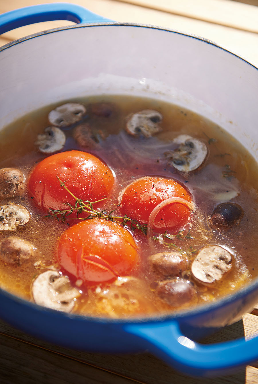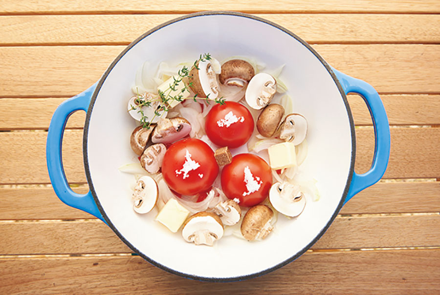 1.トマトを中央に、まわりにタマネギ、マッシュルーム、タイムを入れる。