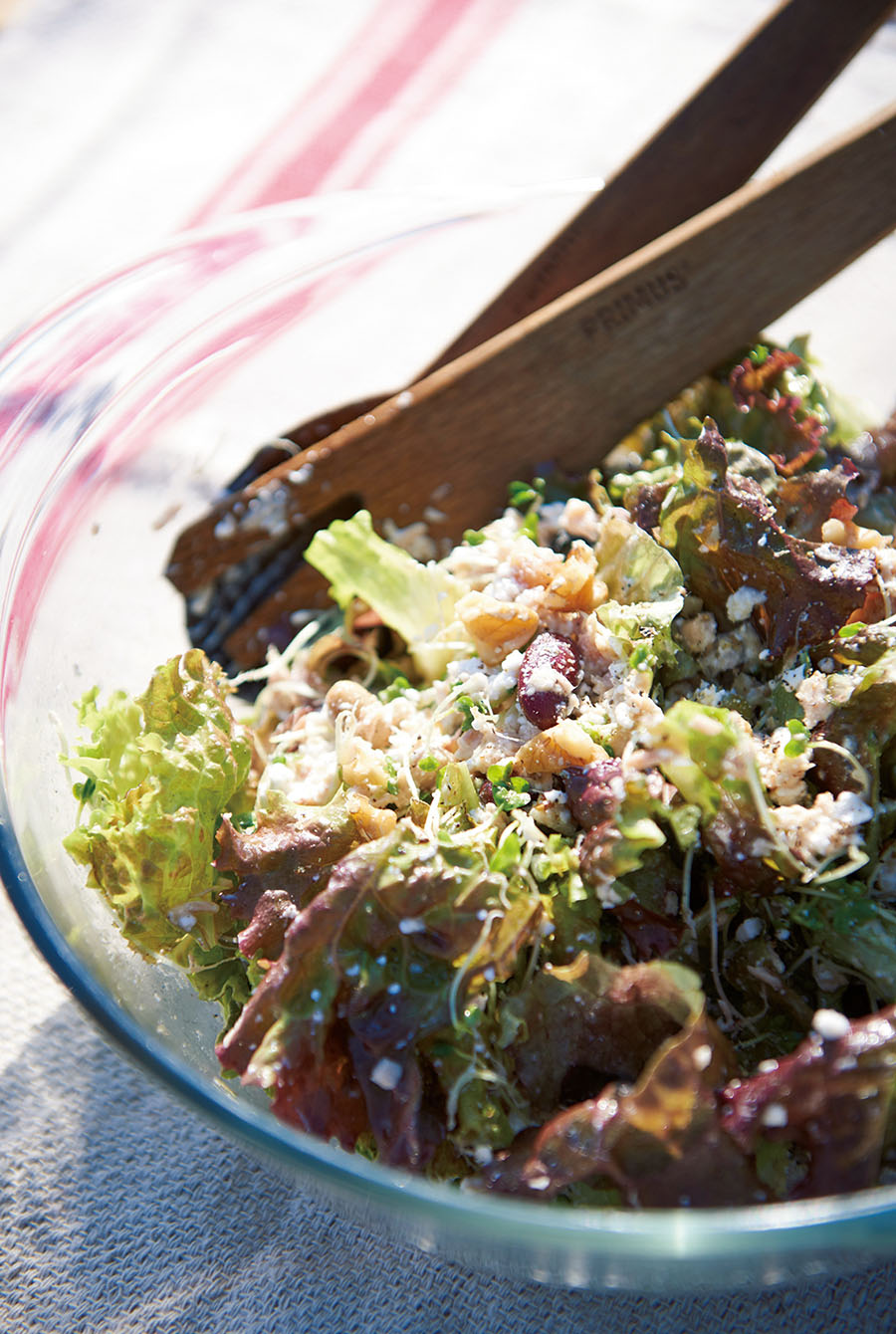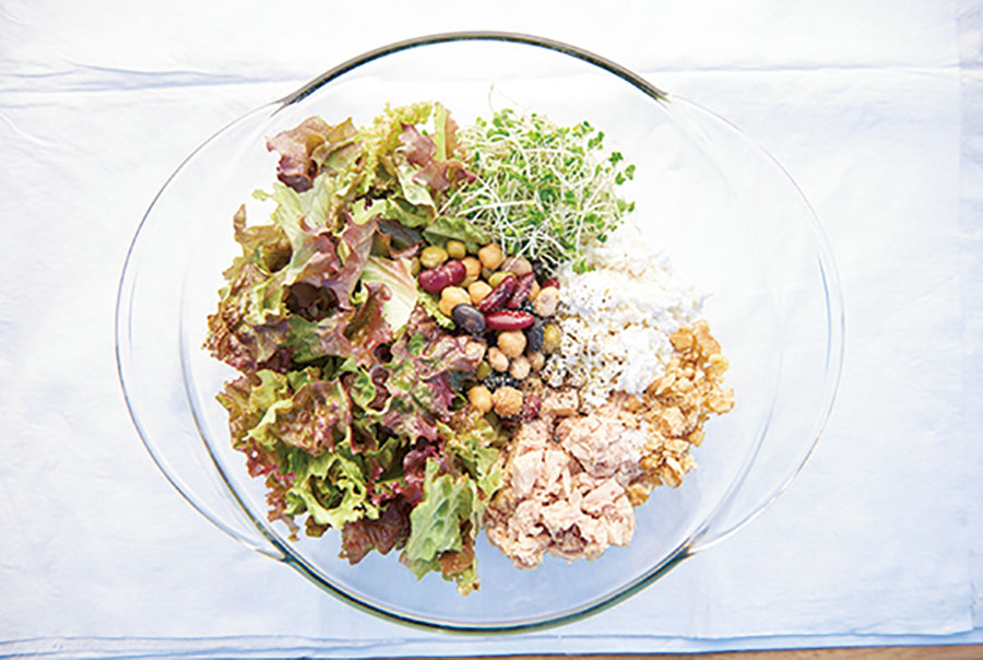 大きめのボウルに好みの生食できる野菜や豆類を放り込み、ざくざくと混ぜるだけのスピードサラダ。脂肪分が少なくあっさりしているカッテージチーズは、混ぜやすい粒状(そぼろ状)タイプが使いやすい。