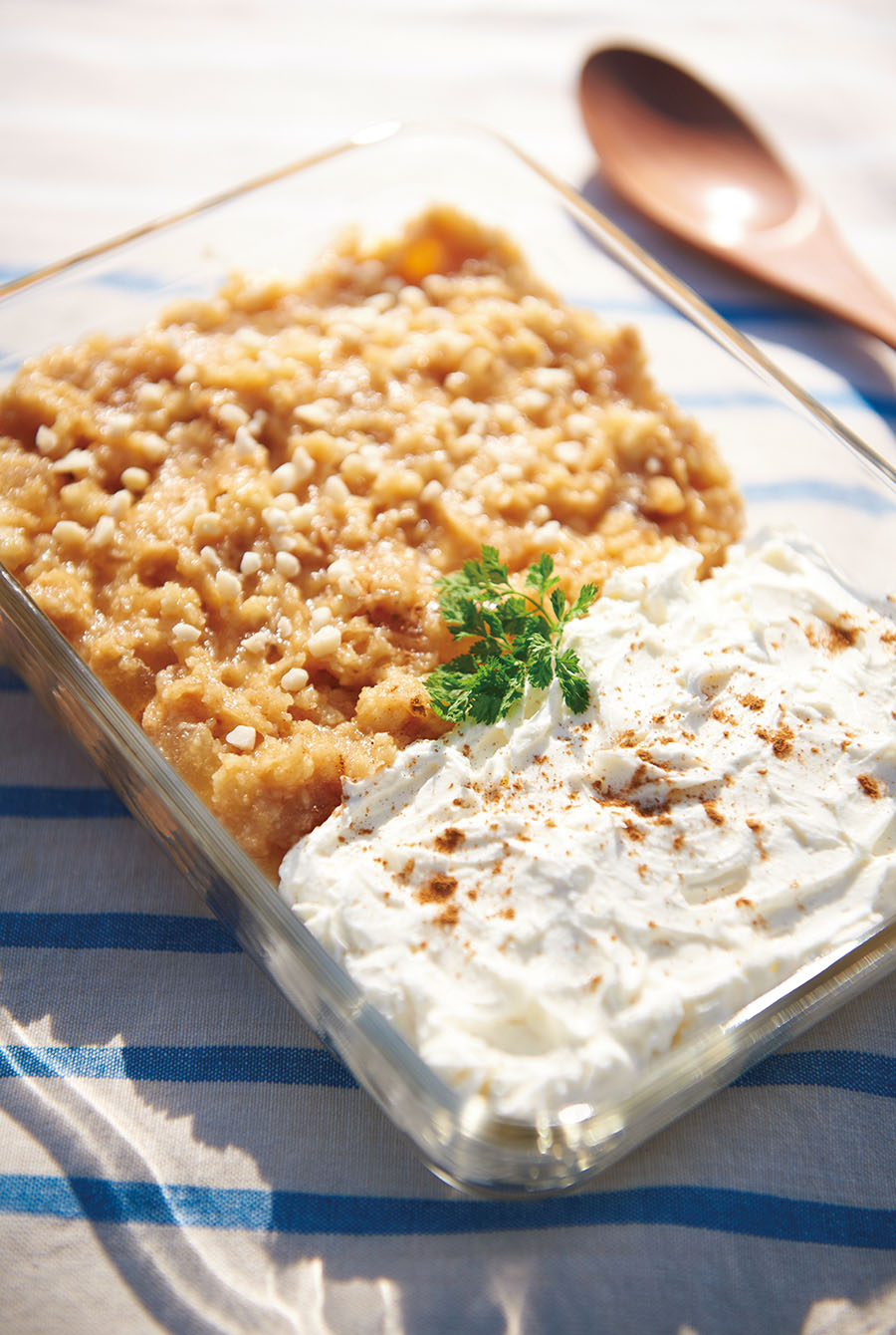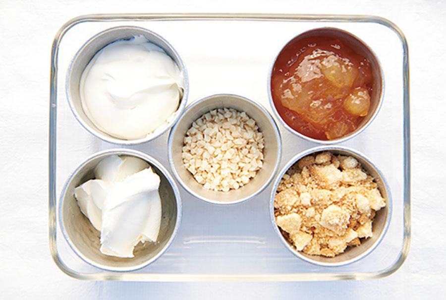 ガラス皿のなかでまさに「アップルチーズパイ」の味わいを再現した、火を使わない超時短デザート。味のポイントはなめらかでさわやかな風味をもつマスカルポーネチーズと、シナモンパウダー。ぜひ取り入れてみて!
