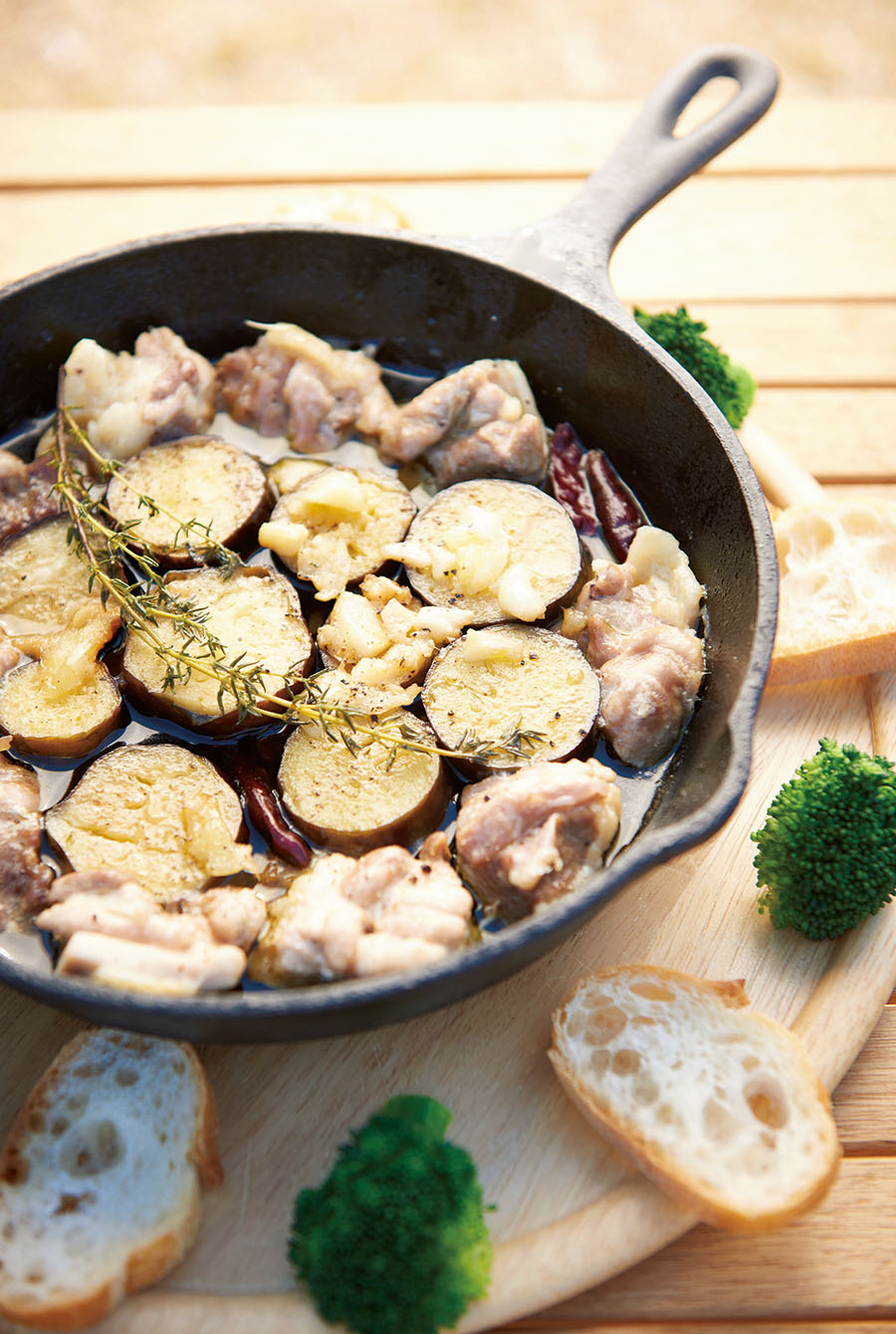 3.中弱火で熱して煮込み、ナスと鶏肉に火が通ったら、茹でたブロッコリーとバゲットを添えてできあがり!