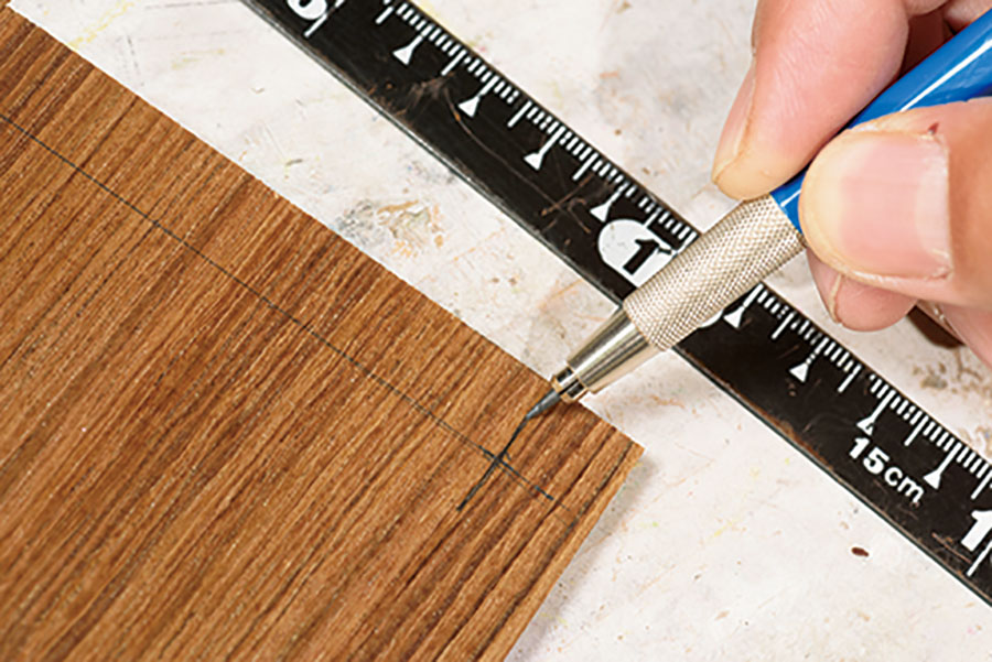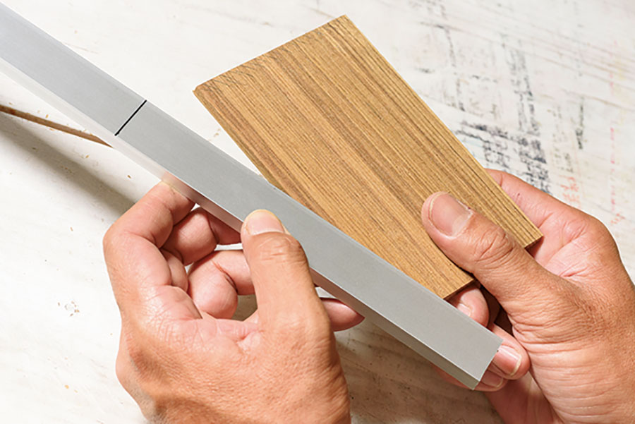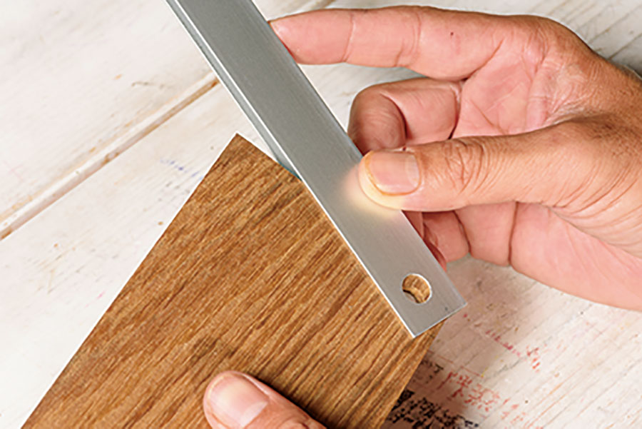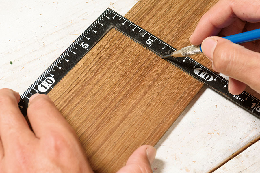 さしがね(定規でもOK)を使って、カットするラインをシャープペン、またはえんぴつなどで引く(以下、すべて2枚の木板を同様に加工)。