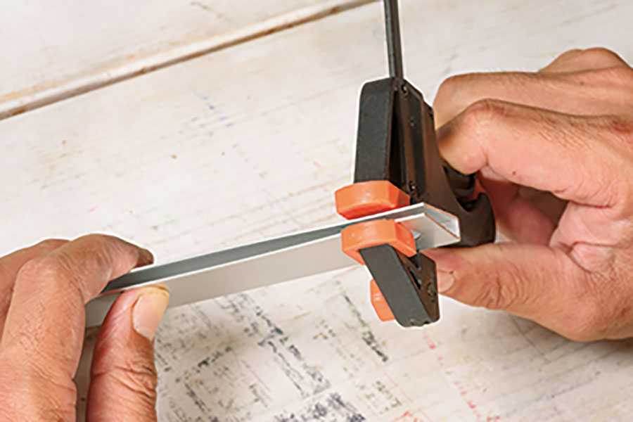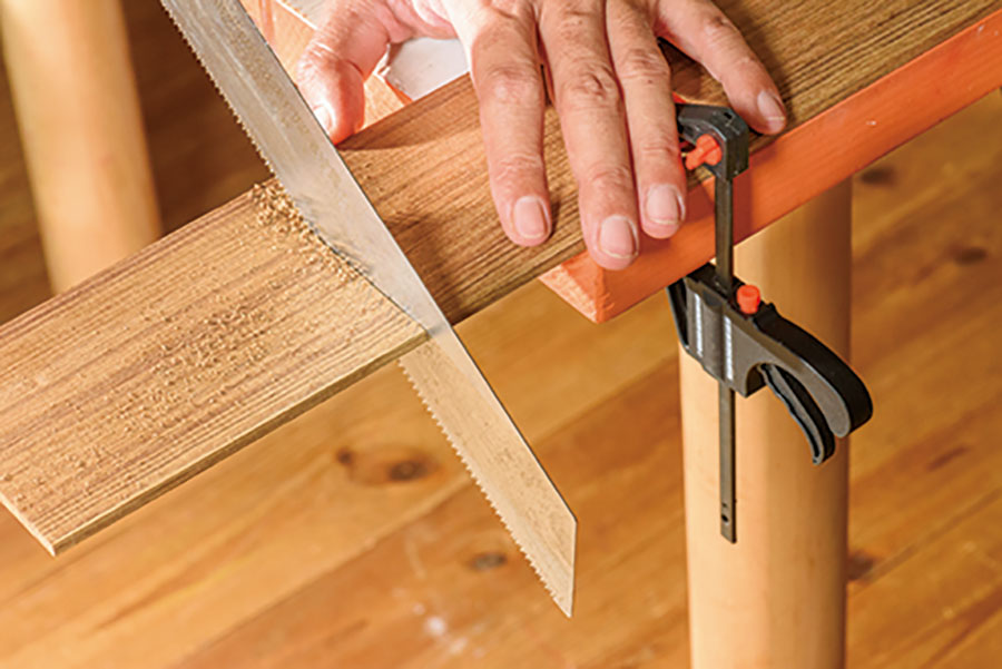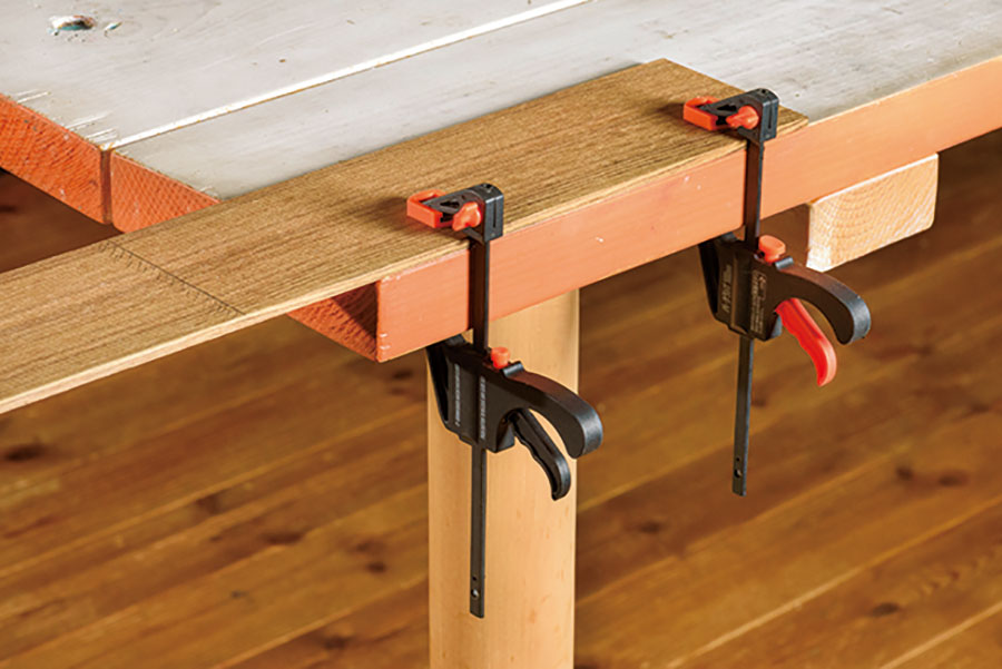 テーブルの端などカットしやすい場所にクランプを使って固定。手で押さえるとカット面が荒くなるのでクランプを使うのがベター。