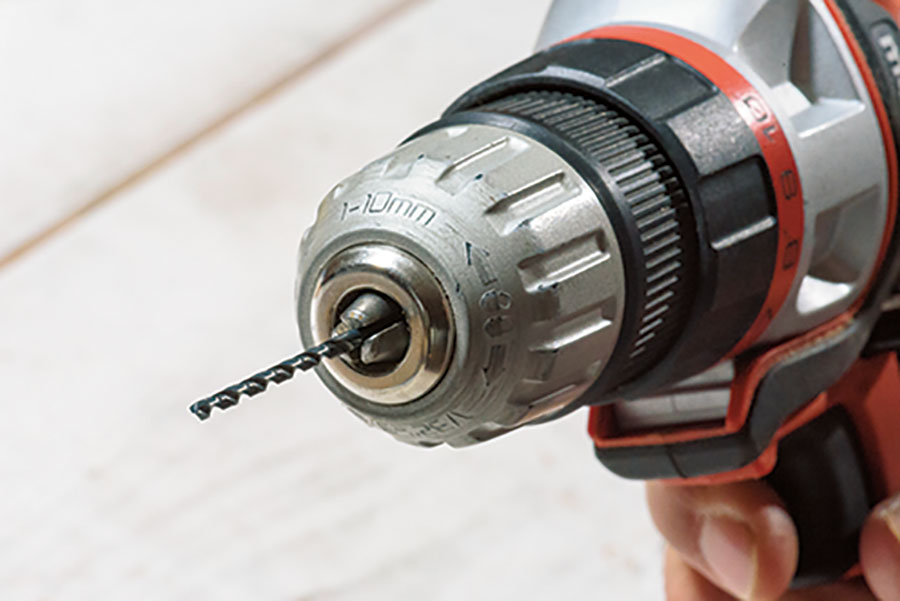 直径10㎜のドリルビットを使って穴を広げる。この時もドリルビットを安定させるために、上から体重を掛けながら行なうこと。