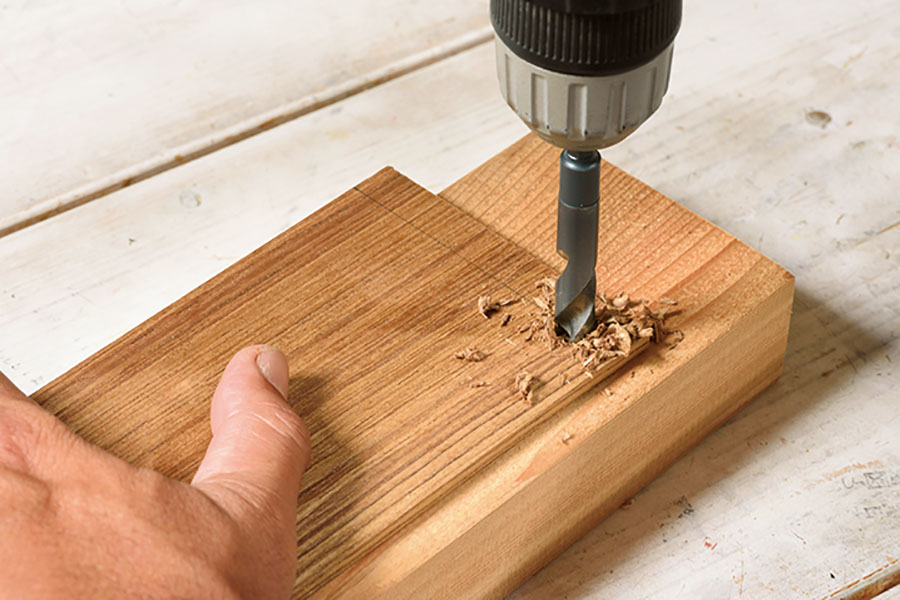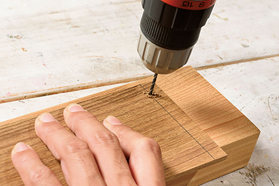 電気ドリルで下穴を開ける。上からしっかりと体重を掛けてドリルビットがずれないように。貫通させるので下に厚めの木板を敷いておく。