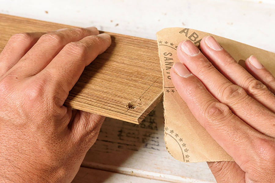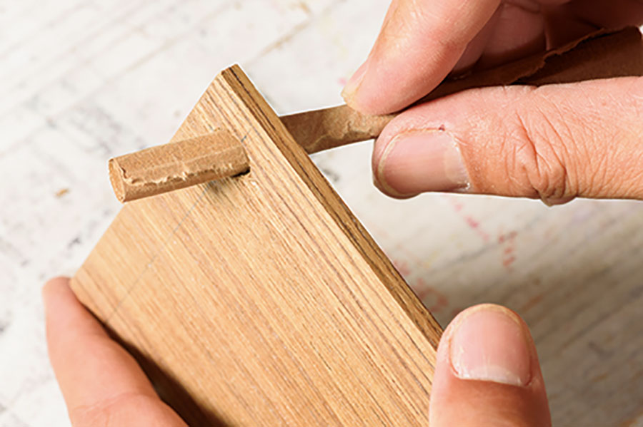 ノコギリ、ドリルビットの切断面を紙ヤスリでならす。穴の部分は紙ヤスリを丸めて回転させるように動かすときれいになる。