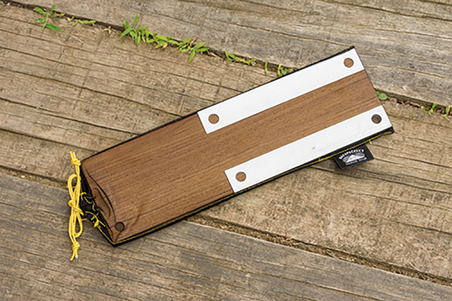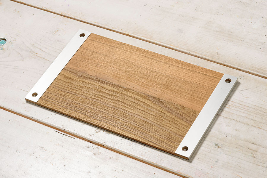 材料は木板とアルミパーツのみ。木板は重さと強度を考えて5㎜の厚さに。木の種類はなんでもいいが、チークは水に強く、丈夫で、さらに色味も落ち着いていて今回のような用途にちょうどいい。アルミ不等辺チャンネルは木板をサイドで固定するために使用。ともに大型のホームセンターなどで購入可。