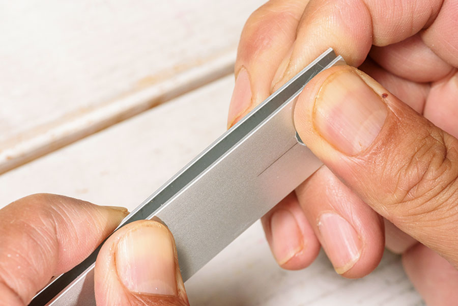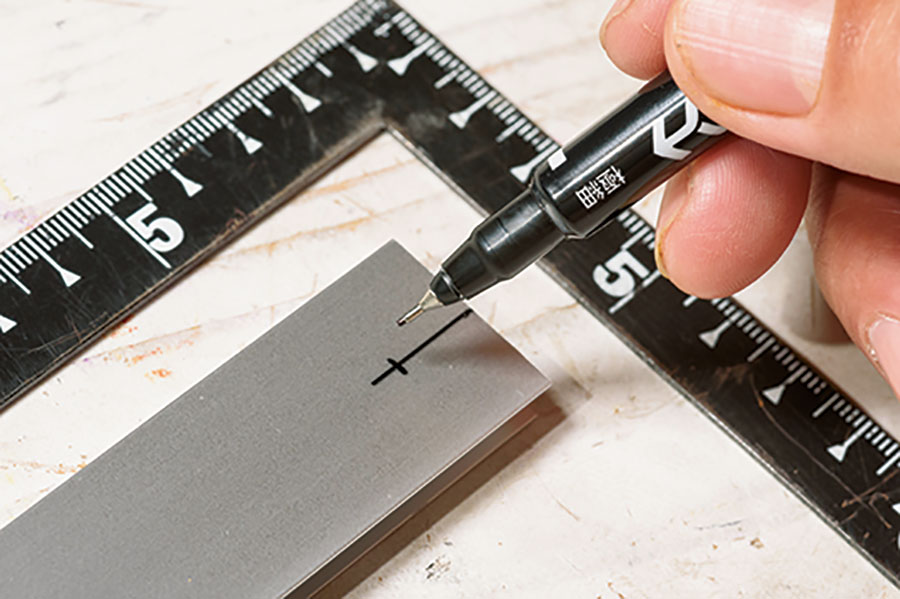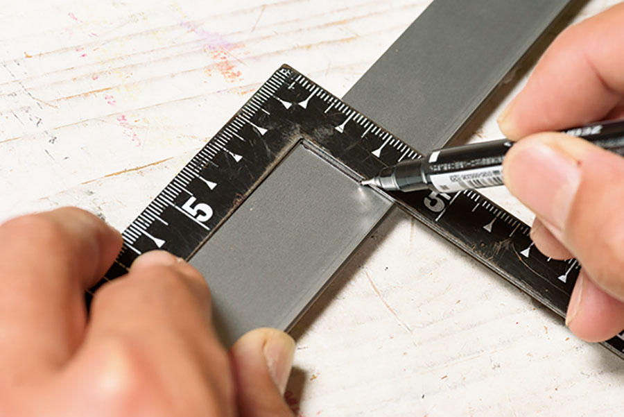 さしがねと油性マーカーを使い、長辺が180㎜となるようにカットする線を引いておく(以下、すべてふたつのアルミパーツを同様に加工)。
