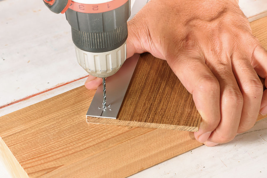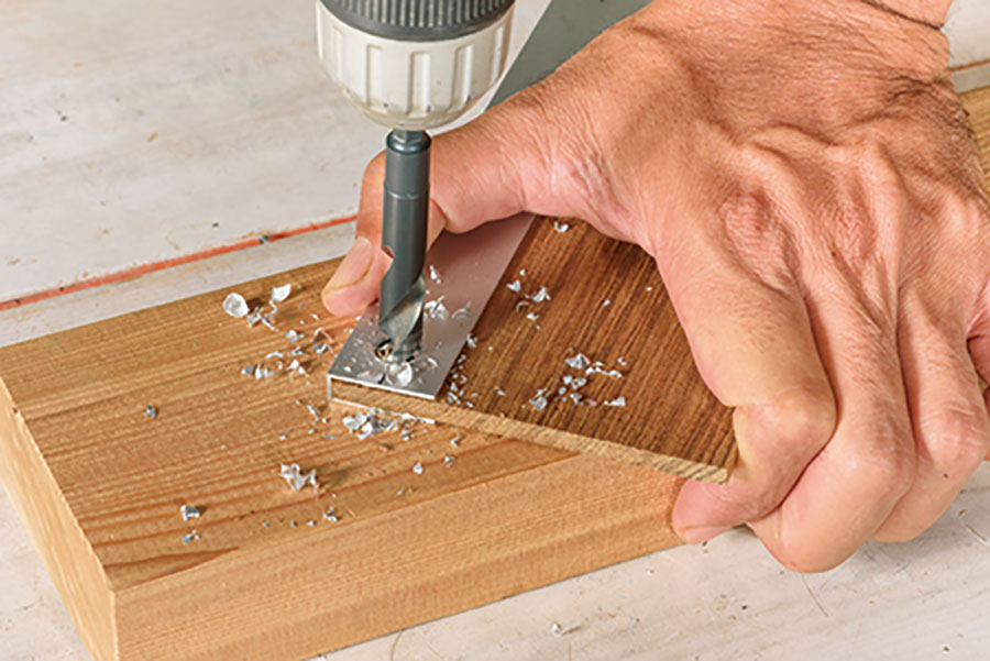 2㎜のドリルビットを使って下穴を開ける。木板の時と同様にしっかりと体重を掛けながらドリルを使い、下には厚めの木板を敷いておく。