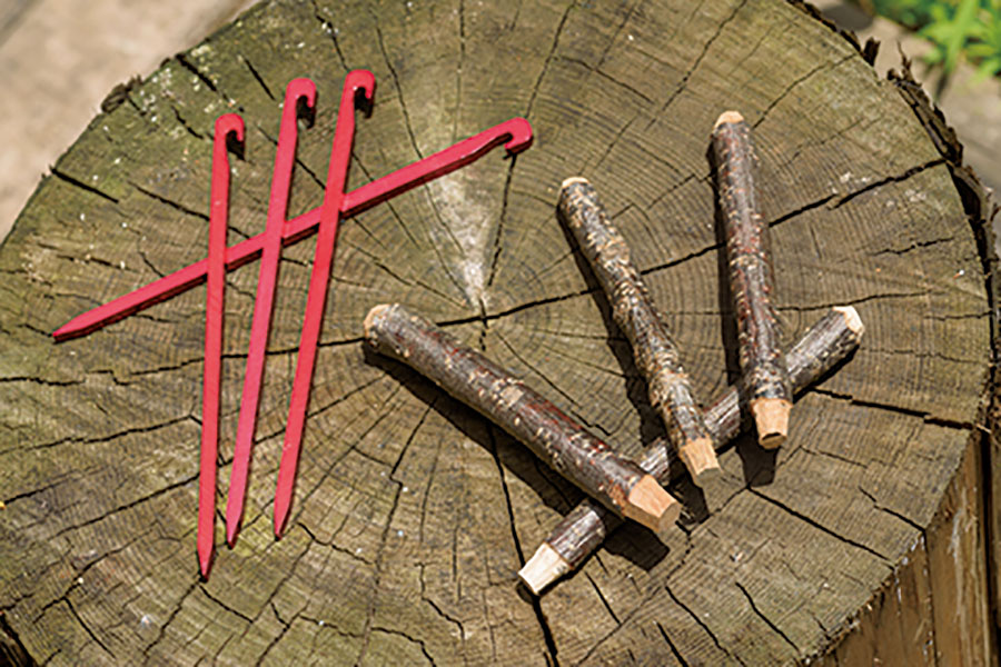 予備のペグや枝(穴に合わせて太さを調整)が脚になる。ペグは写真のようなスティック状のものを使用する。枝の脚なら雰囲気もアップ!