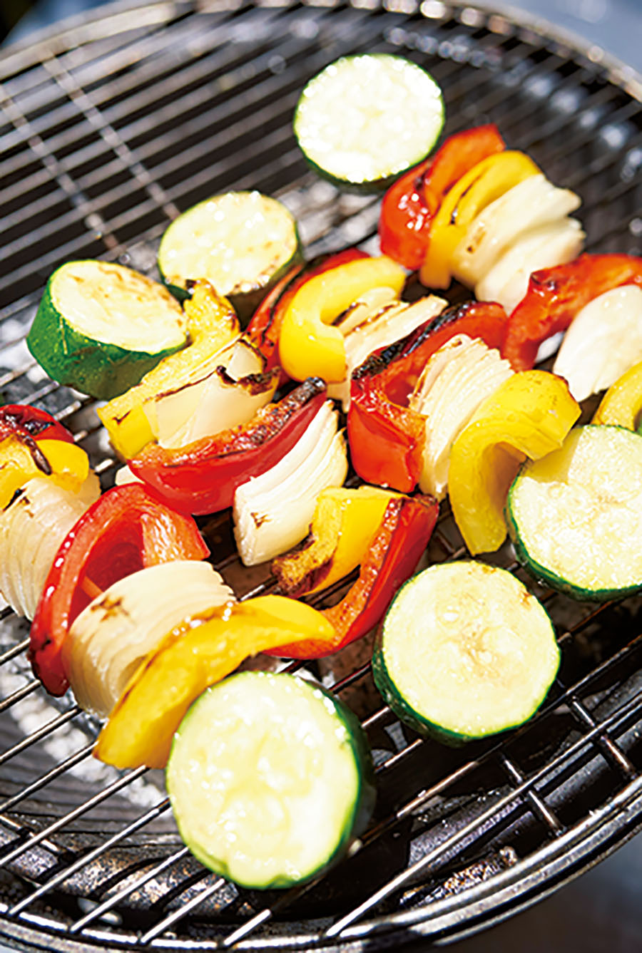 3.ズッキーニが串の両端にくるように彩りを考えて順番に刺す。オリーブオイルをかけて塩を振り、炭火の中火で少し焦げ目が付くまでじっくり焼く。