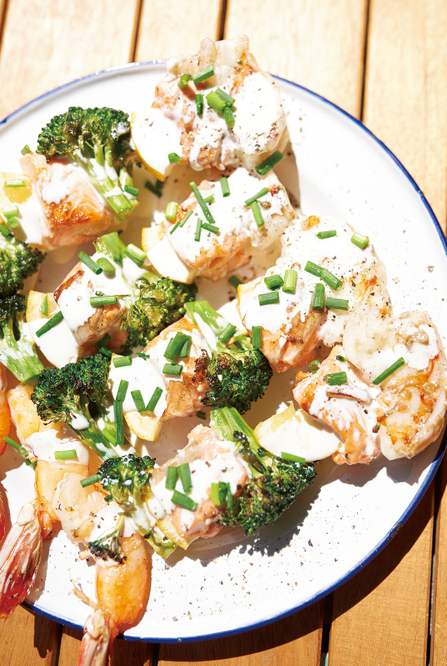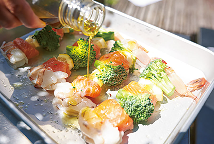 3.エビを串の両端になるように、彩りを考えて食材を順番に刺す。オリーブオイルをかけて塩を振り、炭火の中火で少し焦げ目が付くまでじっくりと焼く。