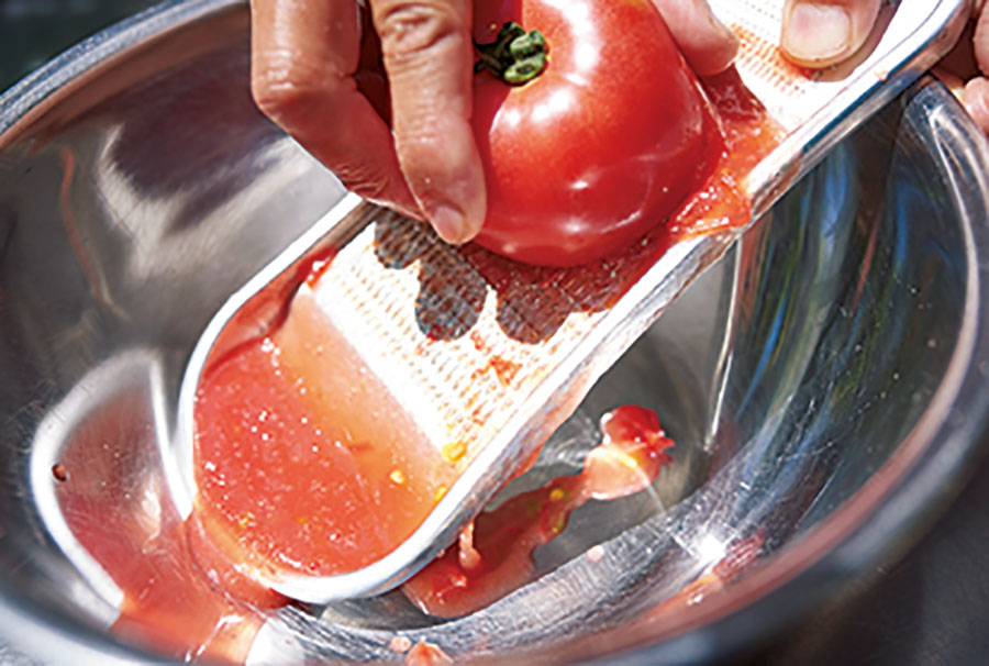 トマトはまるごとすりおろす。湯剥きするとよりなめらかソースに。