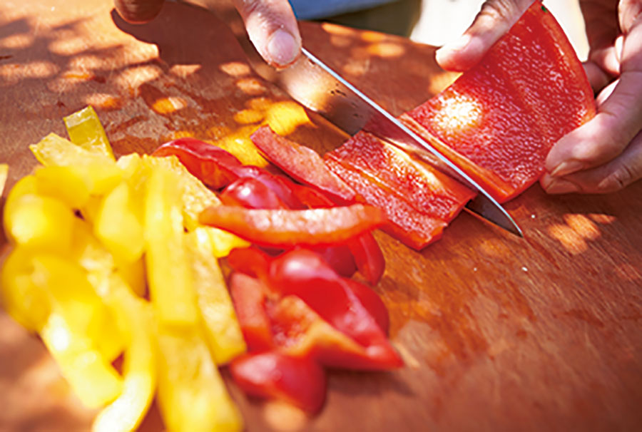 塩で揉むことでタマネギの辛味成分が和らぎ、食べやすくなる。ジューシーなパプリカはあえて大きめに切って食感を楽しんでもよし。
