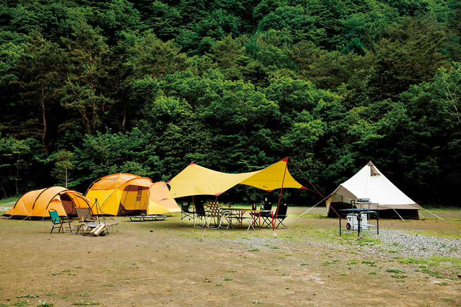 :寝室用テントをほどよい距離感で張って、どこからも集まりやすい形を真ん中に作ってしまったらいいね。あとは大きなタープをひとつ、だれかが用意すれば成り立つ。