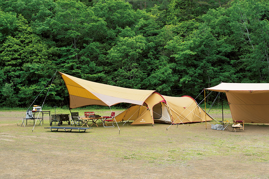 寝室とリビングスペースがひと続きになっているテント。タープ不要で快適にキャンプを楽しめる。締め切って雨風をよけたり、フルオープンにすれば開放感抜群。隣同士が近くなるキャンプインフェスなどではとくに有効。