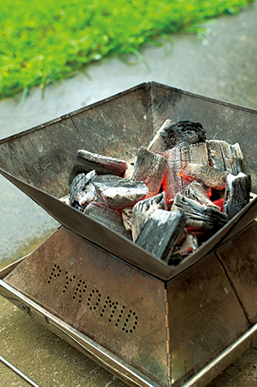 炭火調理に適しているのは、炭の内部まで赤くなり、表面にうっすらと白い灰をまとった“熾き火”の状態。その熾き火になるまで早くても10分ほど要するので、材料が整ってから炭に火を熾していたのでは時間のロス。炭への着火は調理スペースが整ったらいちばん最初に行なうといい。
