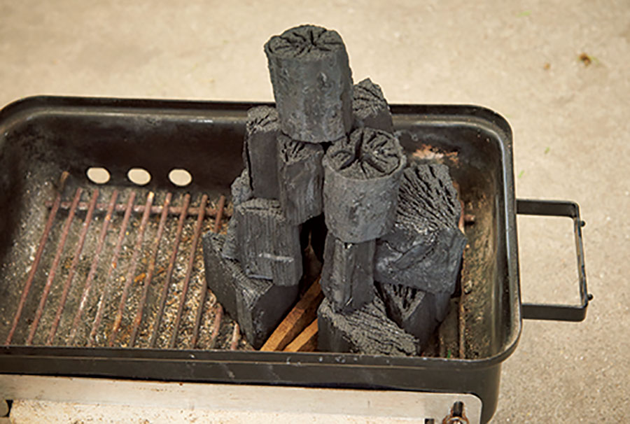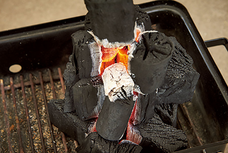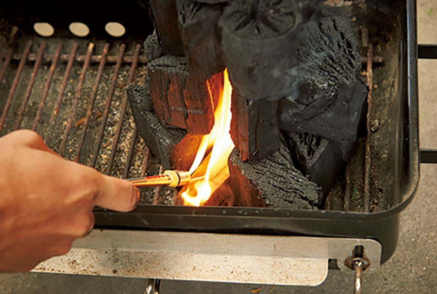 炭火調理に適しているのは、炭の内部まで赤くなり、表面にうっすらと白い灰をまとった“熾き火”の状態。その熾き火になるまで早くても10分ほど要するので、材料が整ってから炭に火を熾していたのでは時間のロス。炭への着火は調理スペースが整ったらいちばん最初に行なうといい。