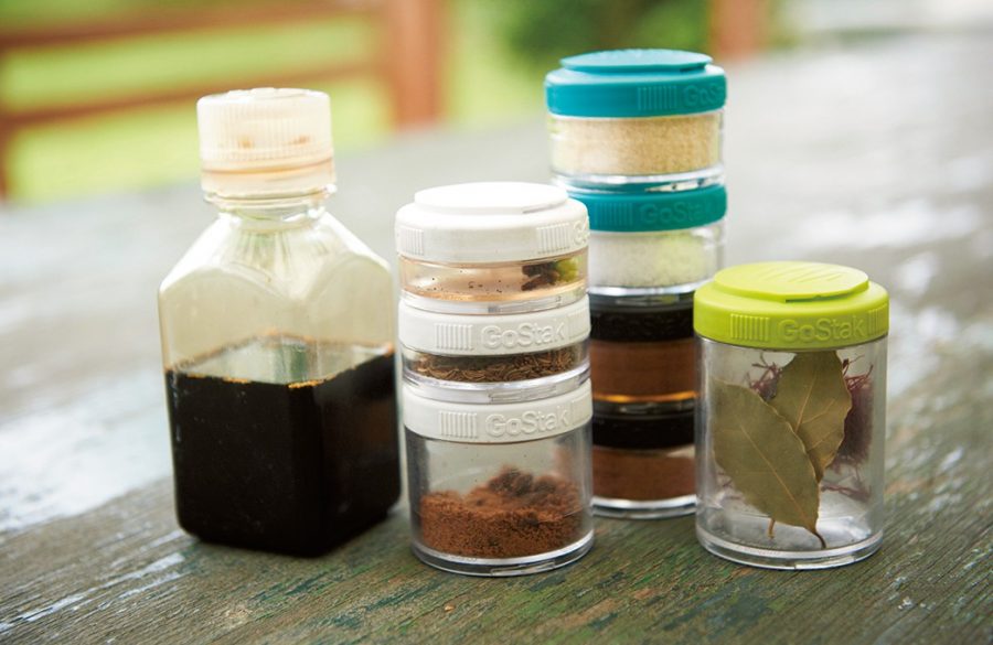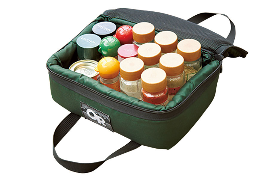 よく使う基本調味料やオイル、スパイスなどは、同じ形状の小型ケースに移し替えて持って行くとよい。調味料ボックス内が乱雑にならず、探す手間も省け作業がスムーズ。また粉状の調味料は市販のままの小袋では開封後は湿気で固まってしまうものもあり、密閉製が高いケースならそういった変化にも対応できる。
