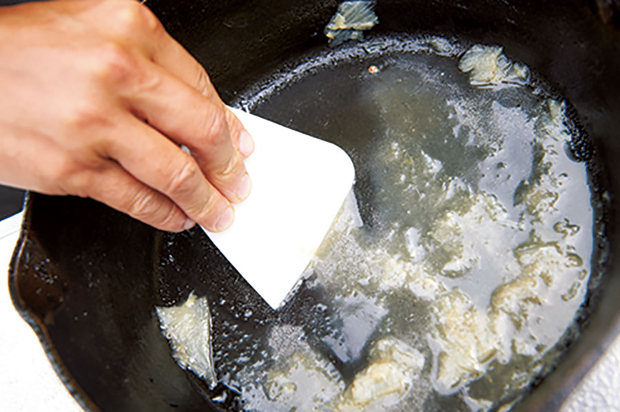 料理の残りカスや焦げ付いた部分はヘラでこそぎ落とし、ボロ布などで拭う。