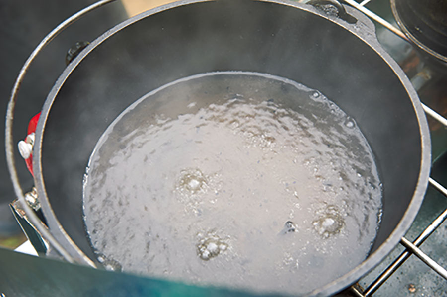 給湯設備のあるキャンプ場は便利だが、ない場合はケトルを炭火やツーバーナーにかけ、常時お湯を沸かしておくとよい。後片付けが格段にスムーズになり、溜めがちな洗い物を手が空いている人が片づけやすくなる。