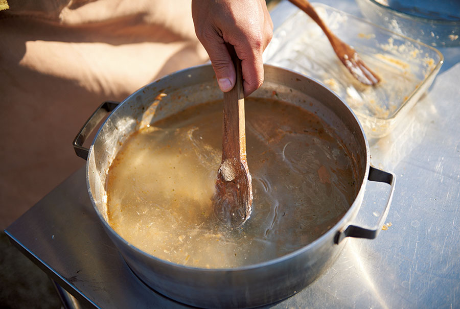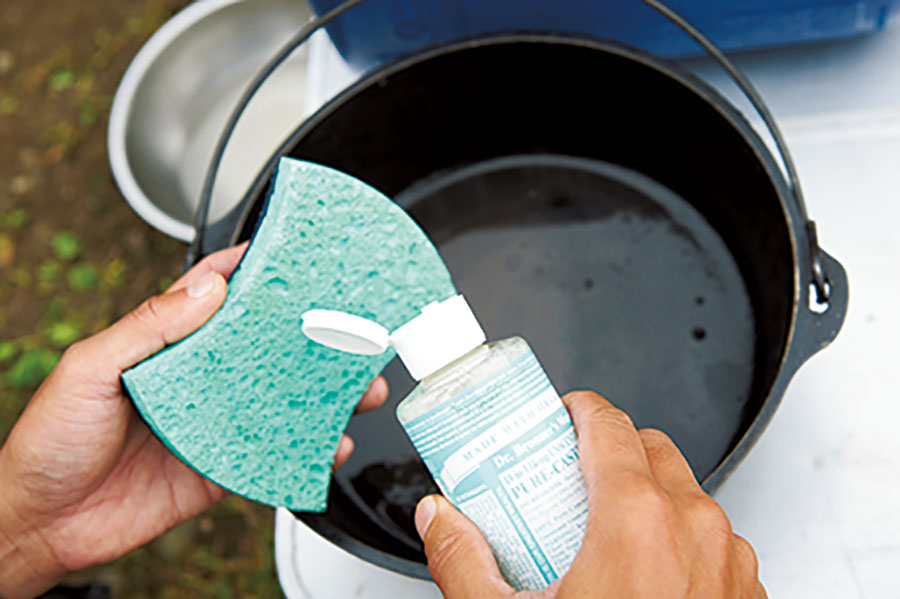 鋳鉄製ダッチオーブンはなじんだ油が抜けるため、基本的に洗剤は使わない。