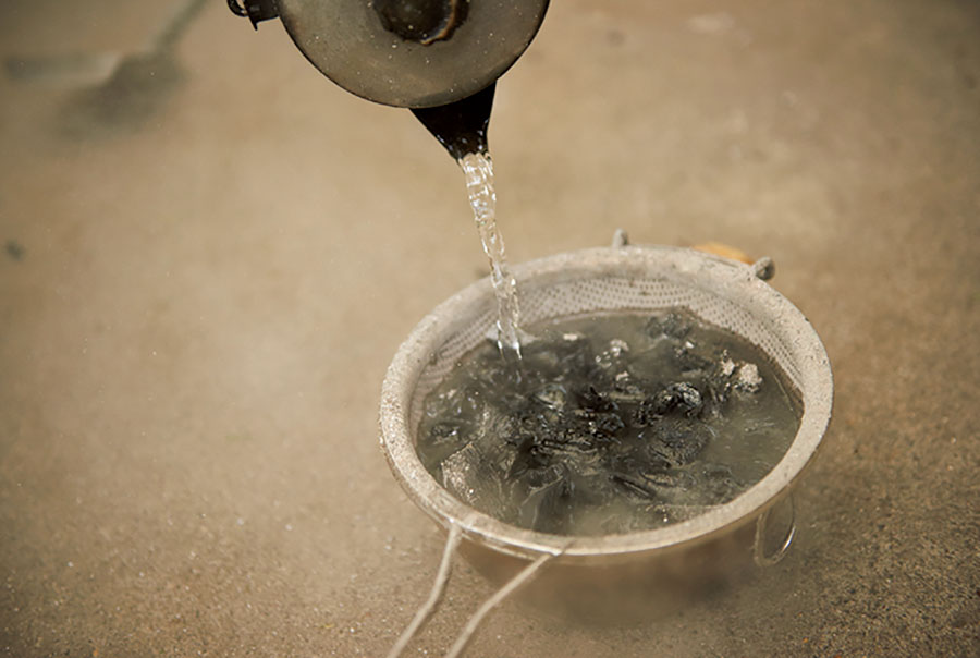 水をたっぷり注いで強制的に炭を消火。熱い蒸気が勢いよく噴出するので気をつけて。