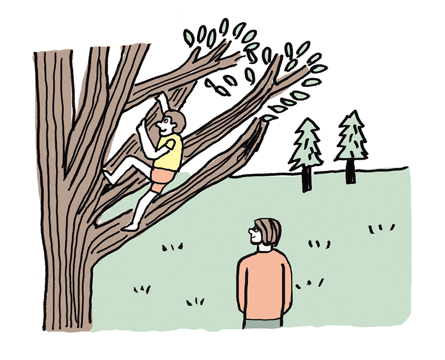 「ポイントは、木の低い場所から枝分かれがたくさんある木を探すこと。そうすると、さまざまなルートで楽しむことができます。もしも最初の一手を掴む木がないときは、クライミング用のテープスリングを木にかけてあげると登りやすくなります」