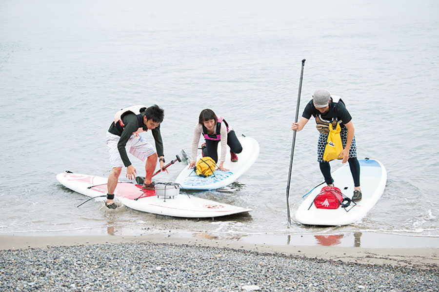 「やった!! 立てた」とふたり。運動不足で足腰がふにゃふにゃの私もなんとか立ち上がり、3人ともひっくり返ることなく無事にスタンドのポジションを取ることができた。「体幹がしっかりしているから、みなさん大丈夫そうですね」と山口さんのお墨付きをもらい、一行は遠くに見える岬を目指して出発。