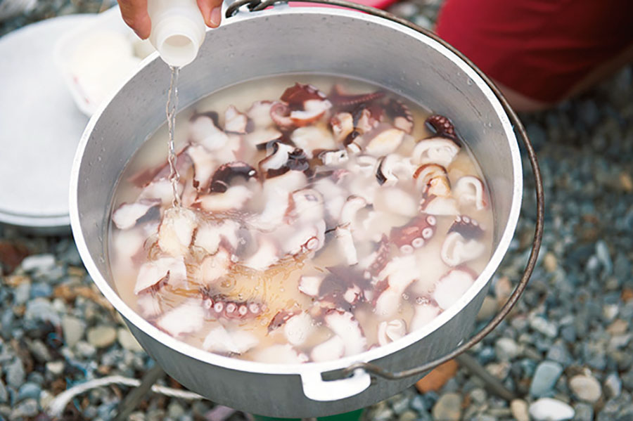ショウゴさんのSUPに積んでいたダッチオーブンを下ろし、白米と水、ぶつ切りにしたタコと醤油にみりん、酒などを豪快に入れ、火にかけて30分ほど放置。すると、お米全体がキレイなピンクに色付いたタコ飯が完成。