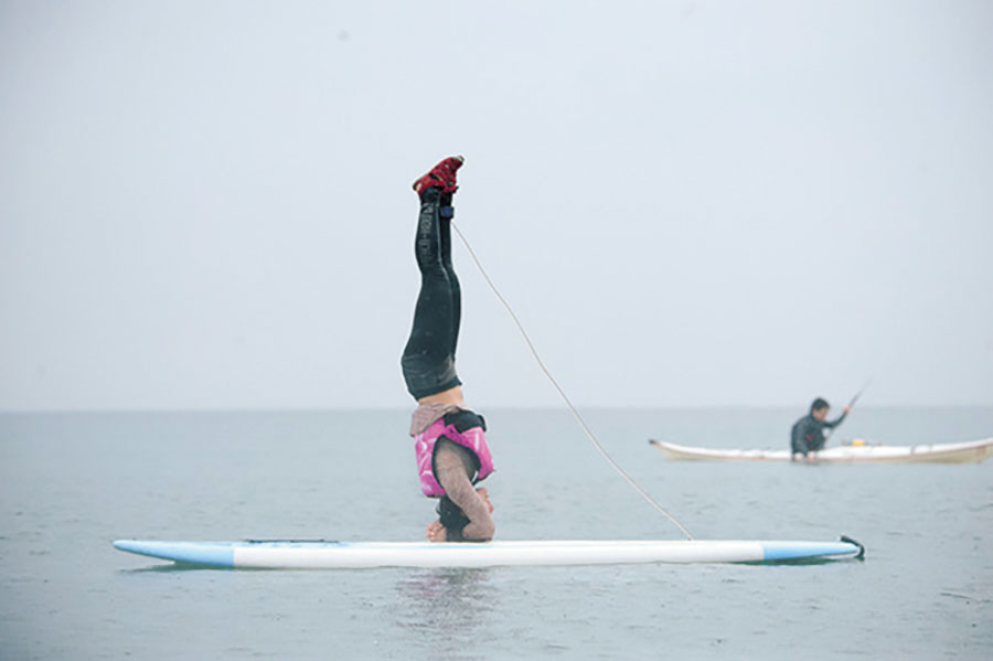 一方のユキさんは、普段ヨガをしているということでポーズに挑戦。漕ぐだけなら比較的簡単なSUPだが、こういった楽しみ方ができるのも魅力のひとつ。
