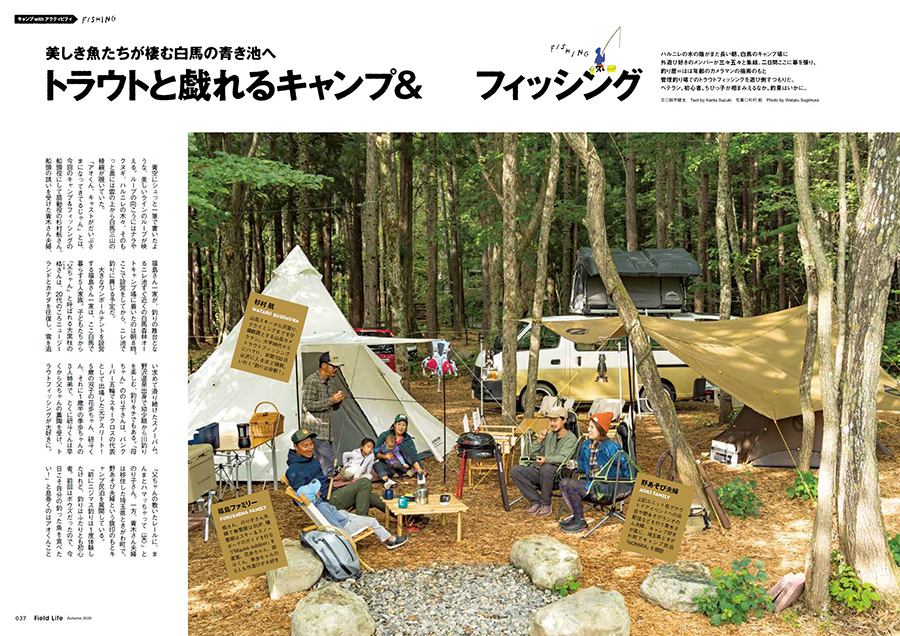 白馬のキャンプ場に外遊び好きのメンバーが集結。釣り歴=ほぼ年齢のカメラマン指南のもと、管理釣り場でトラウトフィッシング。ベテラン、初心者、ちびっ子が相まみえるなか、釣果はいかに⁉