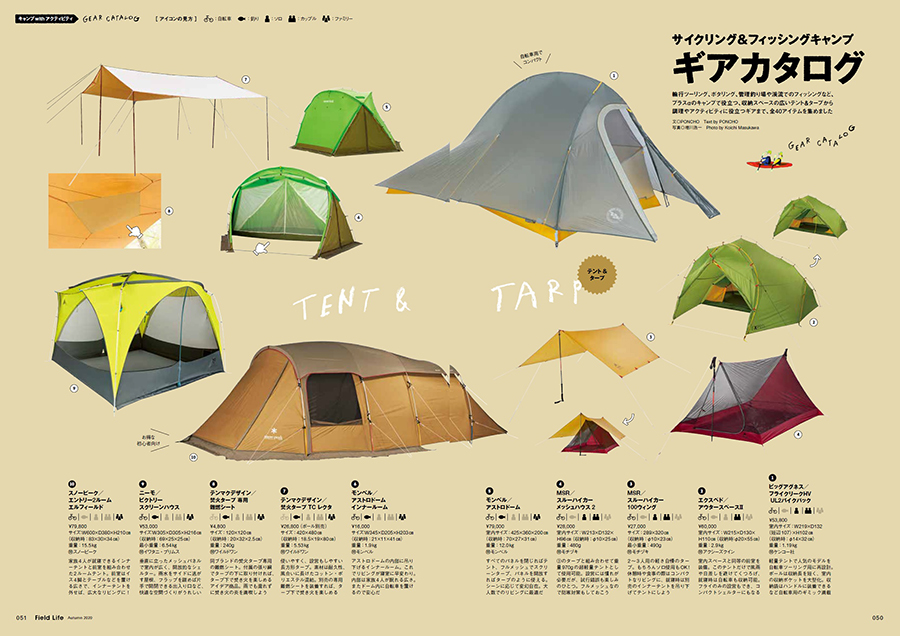 サイクリング&フィッシングキャンプで役立つ、収納スペースの広いテント&タープから、調理やアクティビティに役立つギアまで、全40アイテムを掲載。ぜひお気に入りのアイテムを見つけましょう!