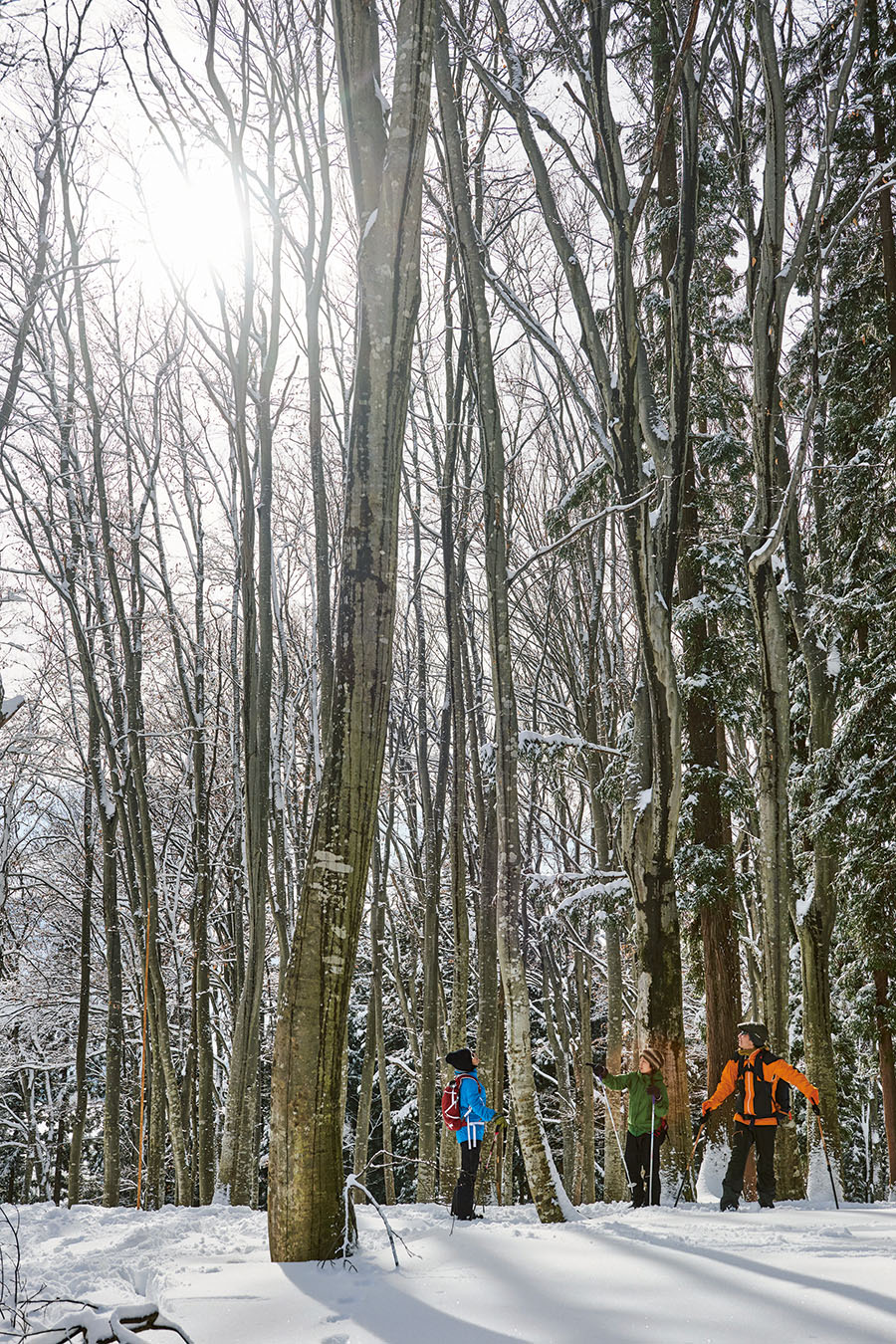 滑ることが目的のバックカントリースキーならほんの数秒で通りすぎてしまう林も、こうしてゆっくり進むと、日ごろ近くでじっくり感じることのない香りに出合える。