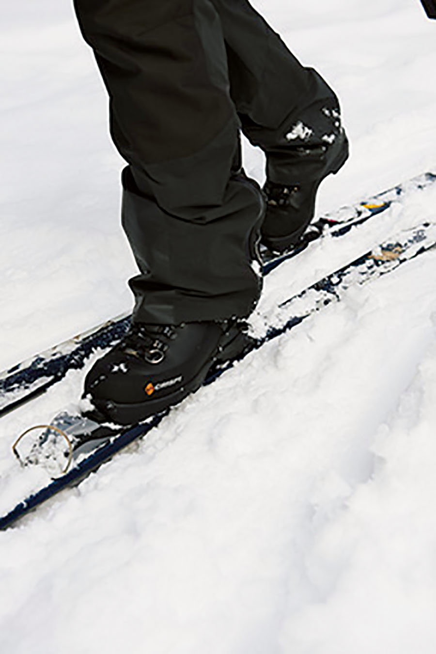 うろこのおかげで、ちょっとした斜面なら、足をハの字にしなくてもそのままペタペタと雪の上を登ることもできる。普通のスキーに比べてとてもシンプルで原始的な道具で、ブーツは革のヒモ靴、ビンディングはつま先を引っ掛けるように固定するだけ、板も細めで道具全体が驚くほど軽い。