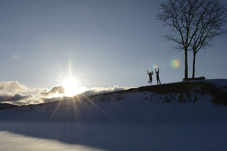 平沢峠展望台まではわずかな距離だが、まったく除雪車の入っていない道は雪が深すぎる部分もあって、手強い相手。ふたりはときどき深い雪溜まりにハマってしまい、転ぶこともあったが、フカフカの雪だからのダメージは少ない。