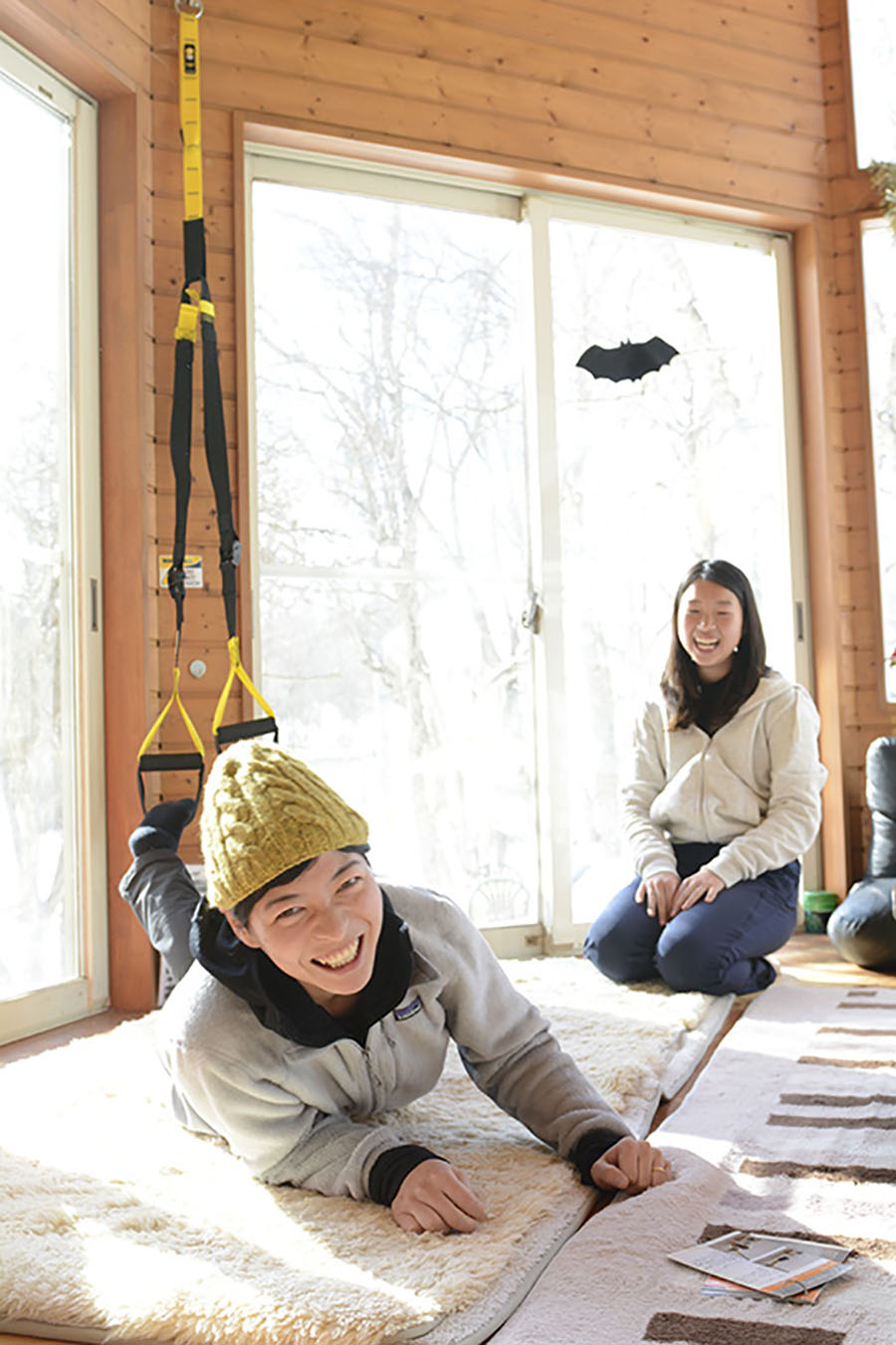 シーナックに戻って朝食をとりながら、今日のライドの打ち合わせ。ワイワイ盛り上がる一階のリビングには、見たことのないトレーニンググッズがいくつも設置されている。興味を示したふたりが試してみると、数回試しただけで、「え〜、キツい!」と叫び声。「キツすぎて笑っちゃう」という境地に。
