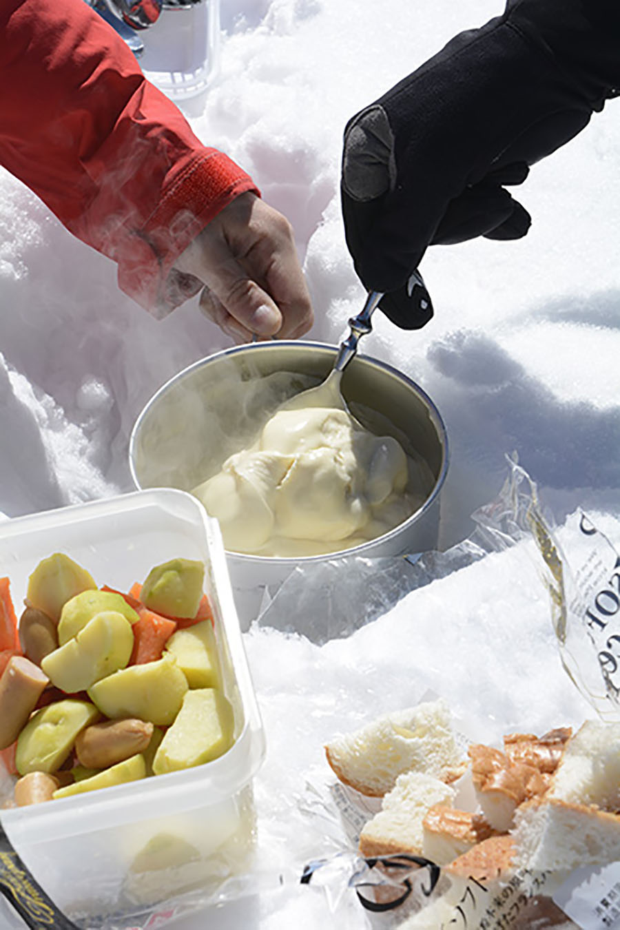 平沢峠展望台では積雪を利用してテーブルを作り、その中央に穴を掘ってバーナーをイン! 由香里さんの用意してくれた食材を広げて、ラグジュアリーな雪上チーズフォンデュパーティに。冷えた体にはなによりのご馳走。さっき朝ごはんを食べたばかりなのに、ロケーションの素晴らしさも相まって、ぺろりと食べきってしまった。