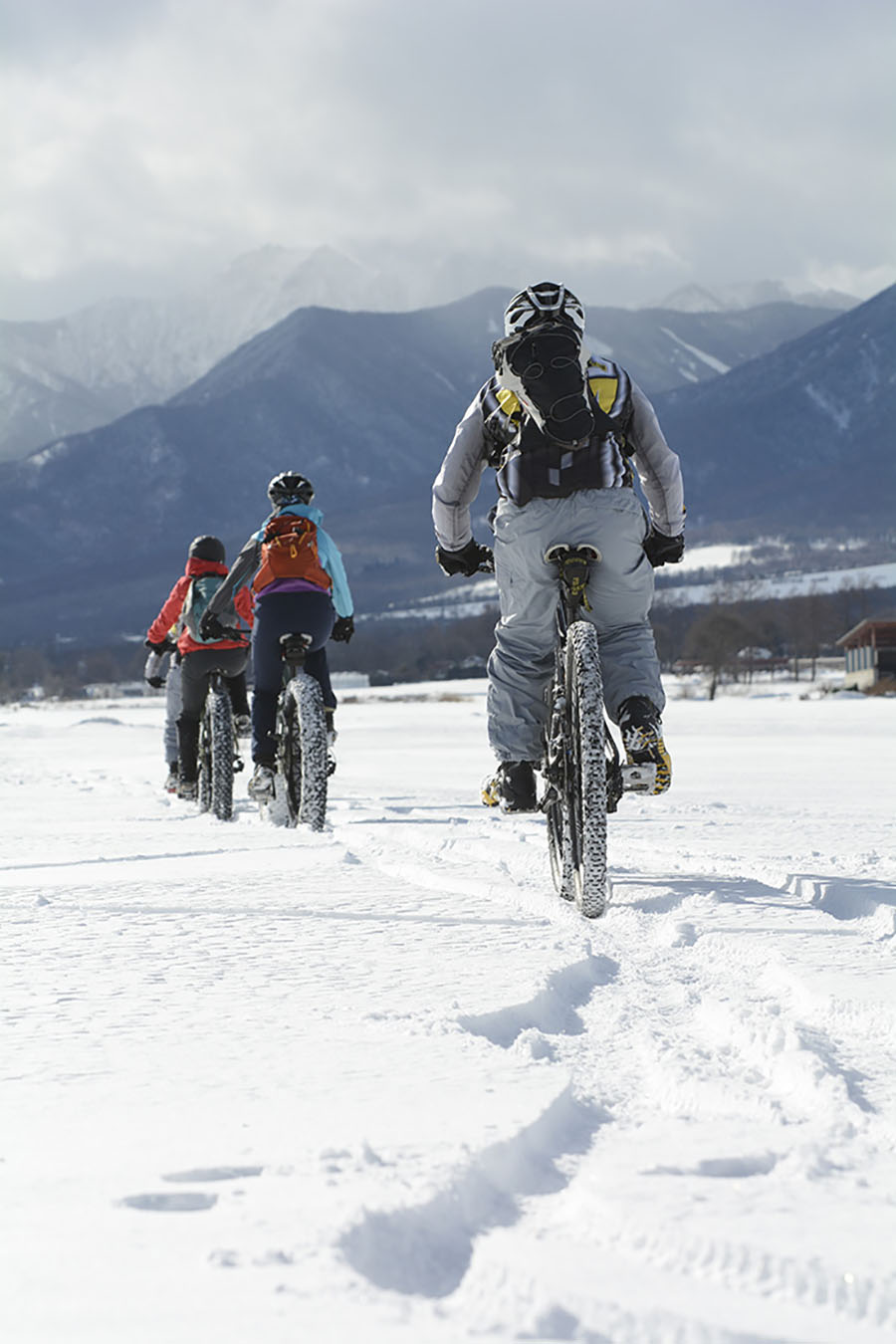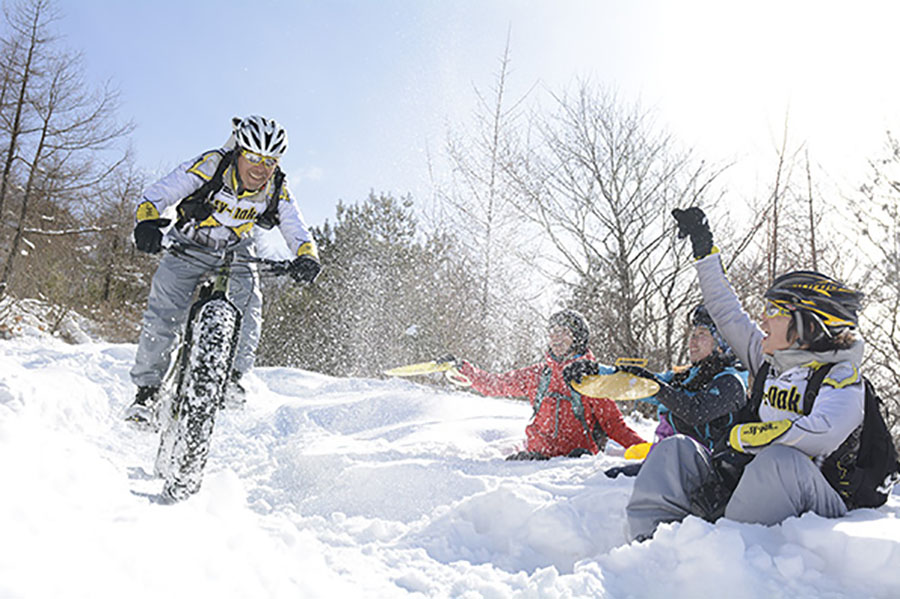 雪上MTBはその年の雪の状態にもよるが、12月後半から3月上旬まで楽しめるそうだ。準備するものは、防寒性の高い服と靴、グローブにヘルメット。服はアウトドアのものがあれば十分で、靴は長靴でもよいとのこと。ほかに特殊なものは必要なし。今回は「シーナック・キャビン」のレンタルバイクを利用した。
