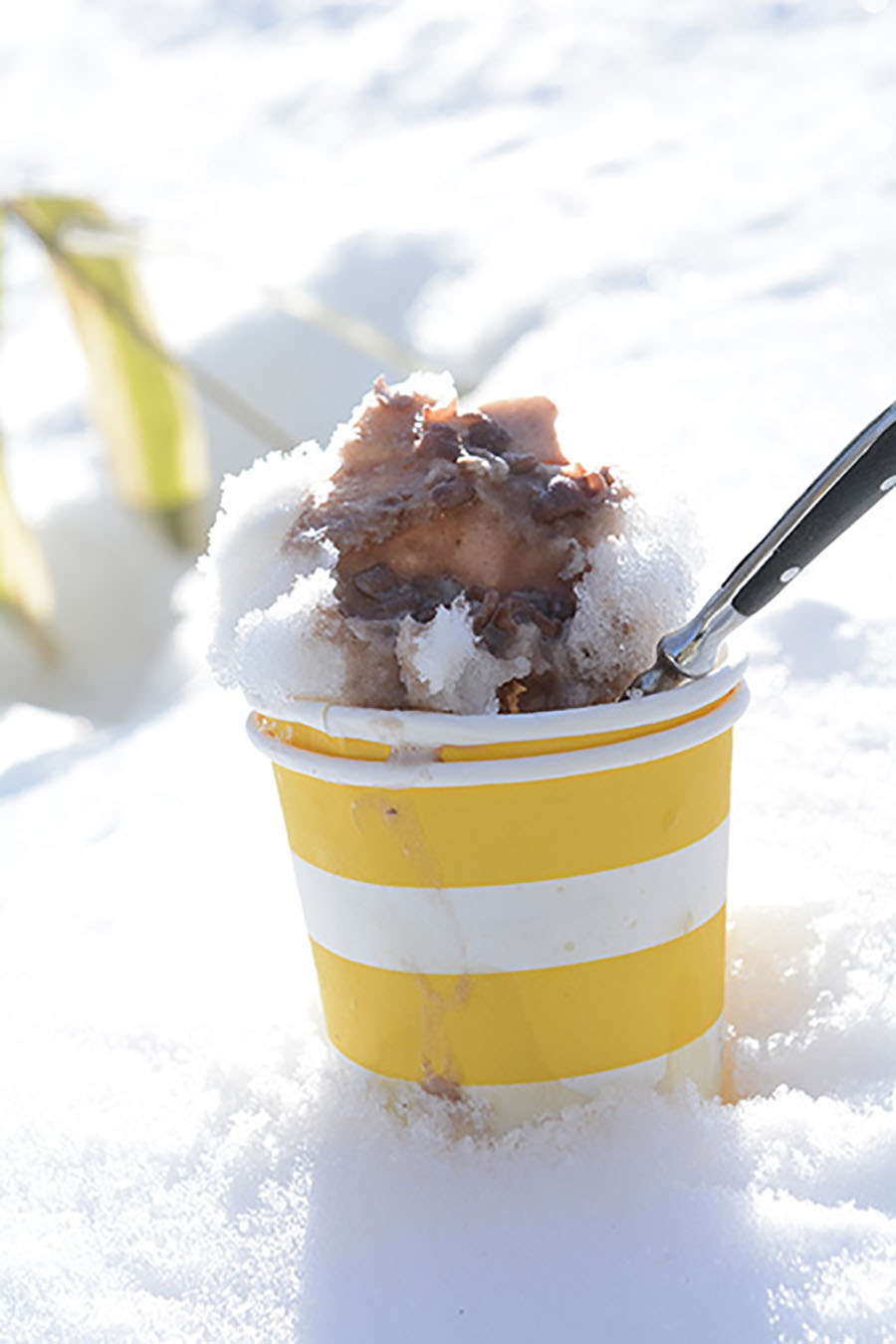凍らせることができなかったので、きれいな雪の上にかけ、小豆ミルクかき氷として楽しんだ。なんでもないことでも〝雪の上〞という環境が、すべてを特別なことにしてくれるのだ。