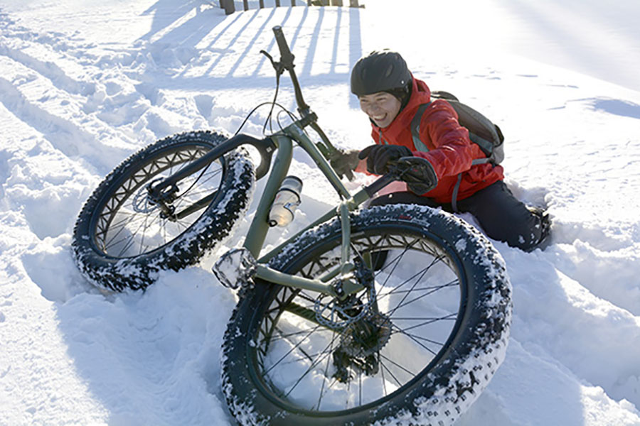 ファットバイクの乗り心地は、言うならばダンプ! その極太のタイヤでちょっとした雪道のデコボコもなんなく乗り越えていく。「MTBでの雪上ライドだとテクニックがないとちょっと難しいところがあるのですが、このファットバイクは初心者でも最初から雪上ライドが楽しめるんですよ」と中込さん。