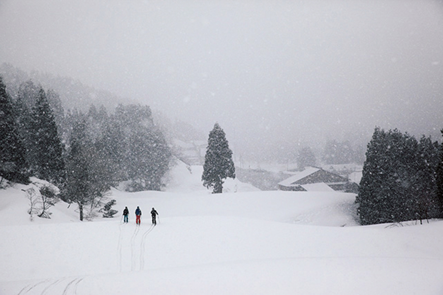 雪が降るなか、シールを張って温井の集落をスタートした。青空を期待するのは難しそうだったが、予報では曇りに変わるはずで、そうなることを期待していた。