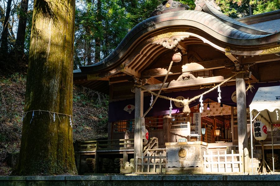 西金砂山の頂上に立つ西金砂神社は、806年に創建された歴史ある神社。西金砂神社もトレイルに含まれる予定(現在は未開通)で、山の上から望む景色もすばらしい。