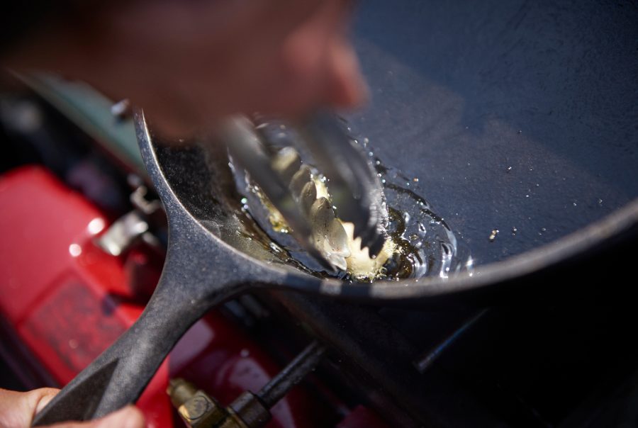 スキレットを中火で熱し、オリーブ油と潰したにんにくを炒めて香りづけして、一旦にんにくを取り出す。